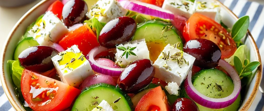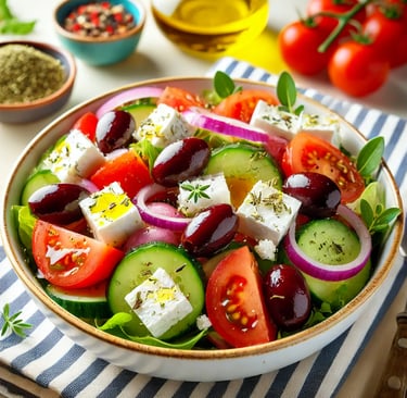 Enjoy a taste of the Mediterranean with this vibrant and refreshing Greek salad. It's packed with bold flavors and colorful ingredients. Tip: To mellow out the sharpness of red onions, soak them in a little vinegar or lemon juice before adding them to the salad.